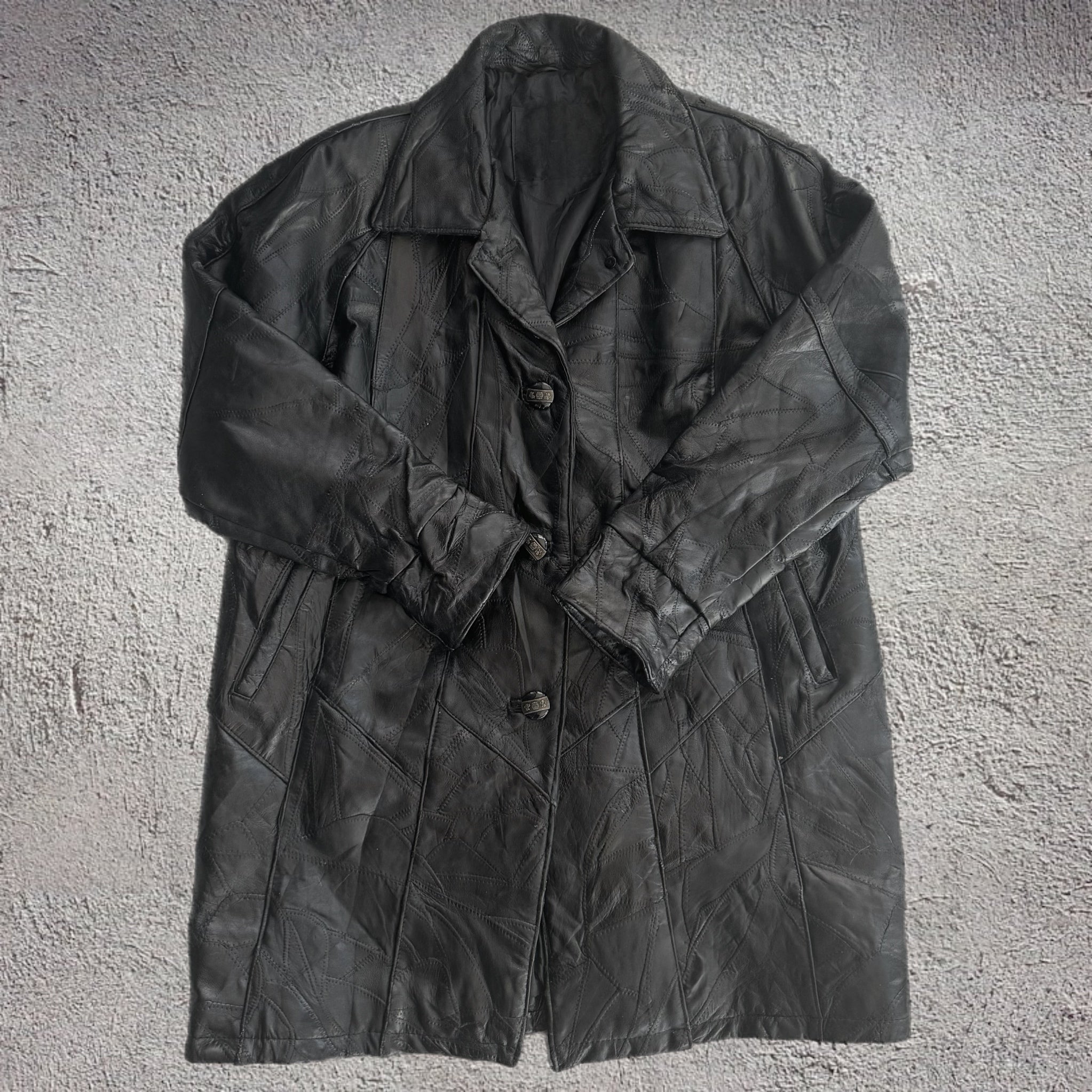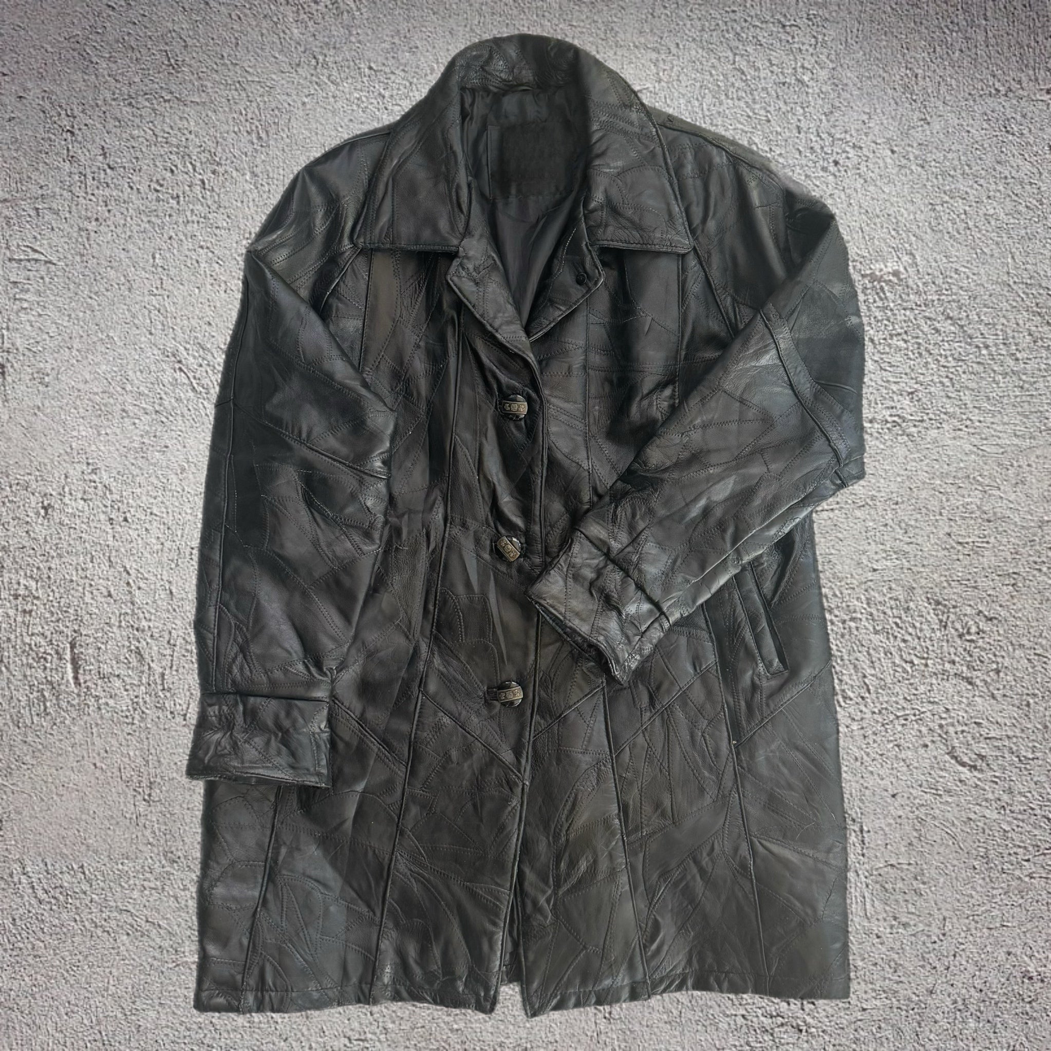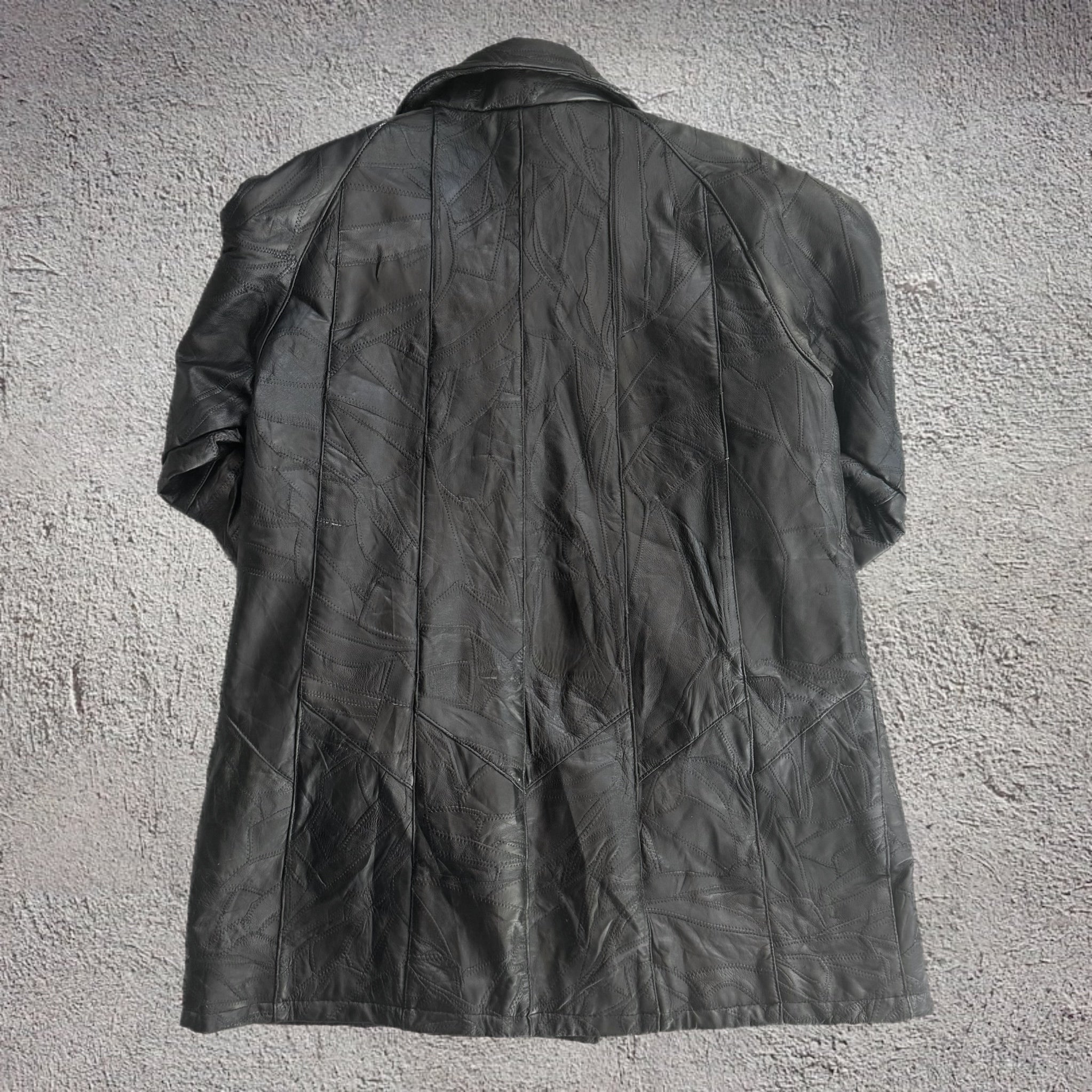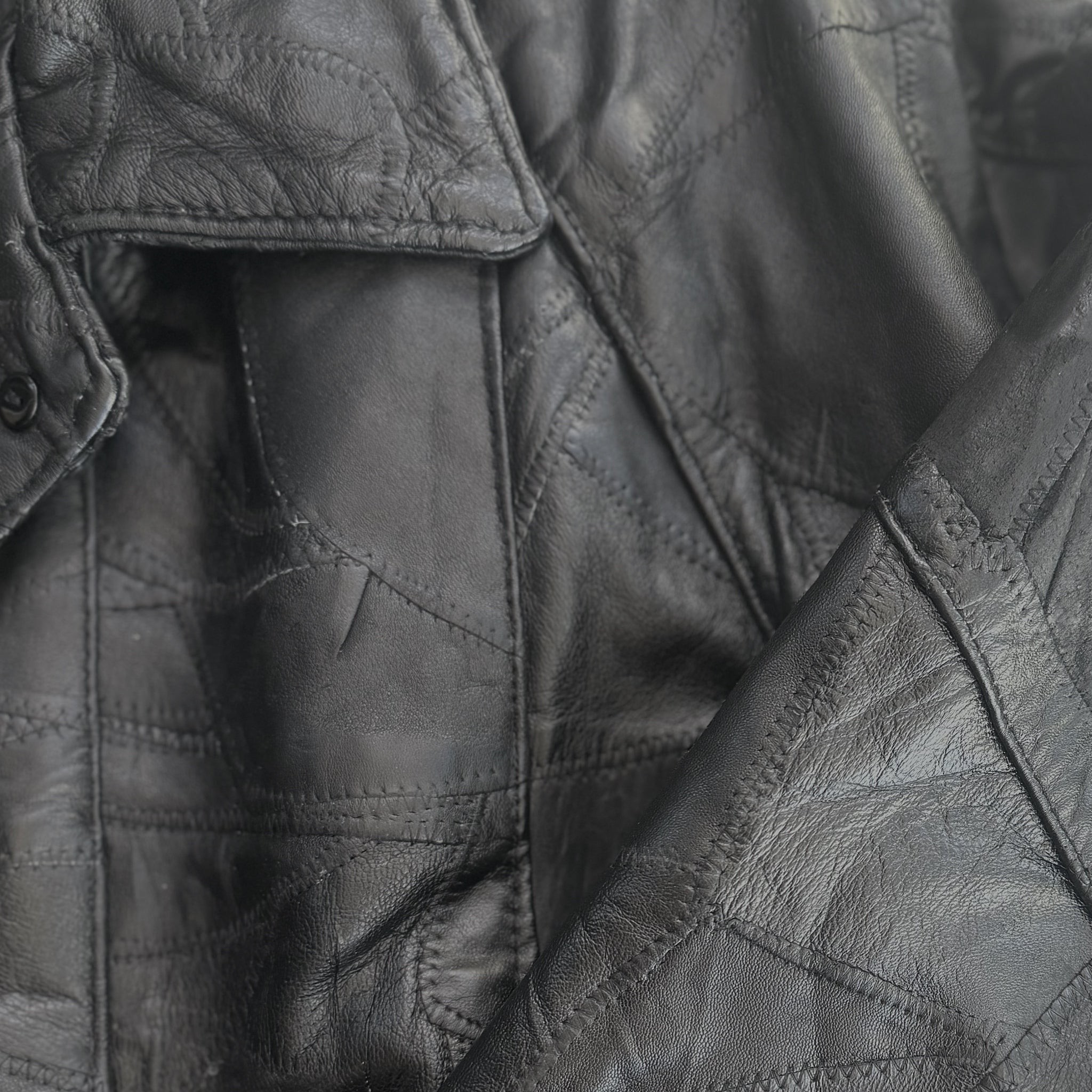 Black Italian mosaic patchwork leather, detailed button closure, outer and left inner pocket detail.